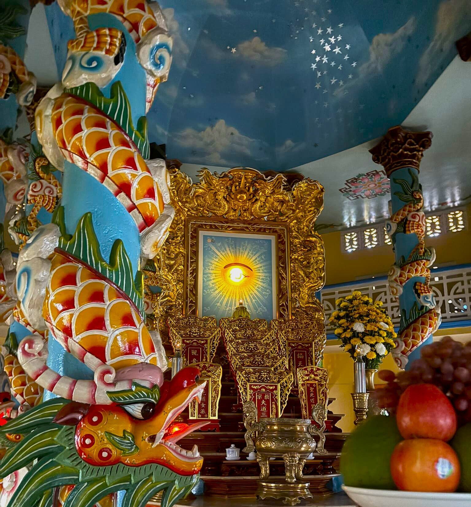 去年旅行したベトナムのダナンが思いのほか良かったので、今回は同じくベトナムのリゾート地のフーコック島に行ってみることにした。ベドジェットのホーチミン乗り継ぎで待ち時間が8時間くらいある。入国にかかる時間や出発の待機などを含めても5ー6時間はホーチミンで使えそうだ。市内観光でもするかと観光スポットを調べてみるが何となくピンと来ない。市場にでも行って地元の店を見ながら、その後ベトナム料理でも食べて過ごすかと考えていた。その時にふと目に留まったのがカオダイ教の神さまの目であった。そうかベトナムといえばカオダイ教だろうと大昔に何かの記事で見たこの宗教のことを思い出した。思い出すと気になり始めてさらに調べていくと、カオダイ教の総本山の中央礼拝堂がホーチミン市から100キロほど離れたホアタインというところにあるらしい。カオダイ教は1920年代にベトナムで起こった比較的新しい宗教で儒教・道鏡・仏教・キリスト教・イスラム教の教えをもとに形作られているらしい。天眼といわれる神の目が描かれた祭壇がありそれを信者は拝礼するようだ。目玉の神様のシールやバッチなど売ってたらお土産に欲しい。これは見に行くしかない、しかし一緒に行く妻や娘がカオダイ教に興味を持つとも思えない。総本山の教会まで往復200キロの道のりを家族3人で行くことができるのか?車のチャーターをするのかレンタカーかなどとツラツラ考えていたら、ホーチミン市内にも教会があることが分かった。というかそもそも最初に観光案内サイトで見た神の目はホーチミンの教会のものであった。観光客の拝観も受け入れているようなのでそこに行くことにした。市内観光の一つということにしておけば妻や娘も反対しないであろう。余った時間は市場を見たり食事などに充てることにしよう。