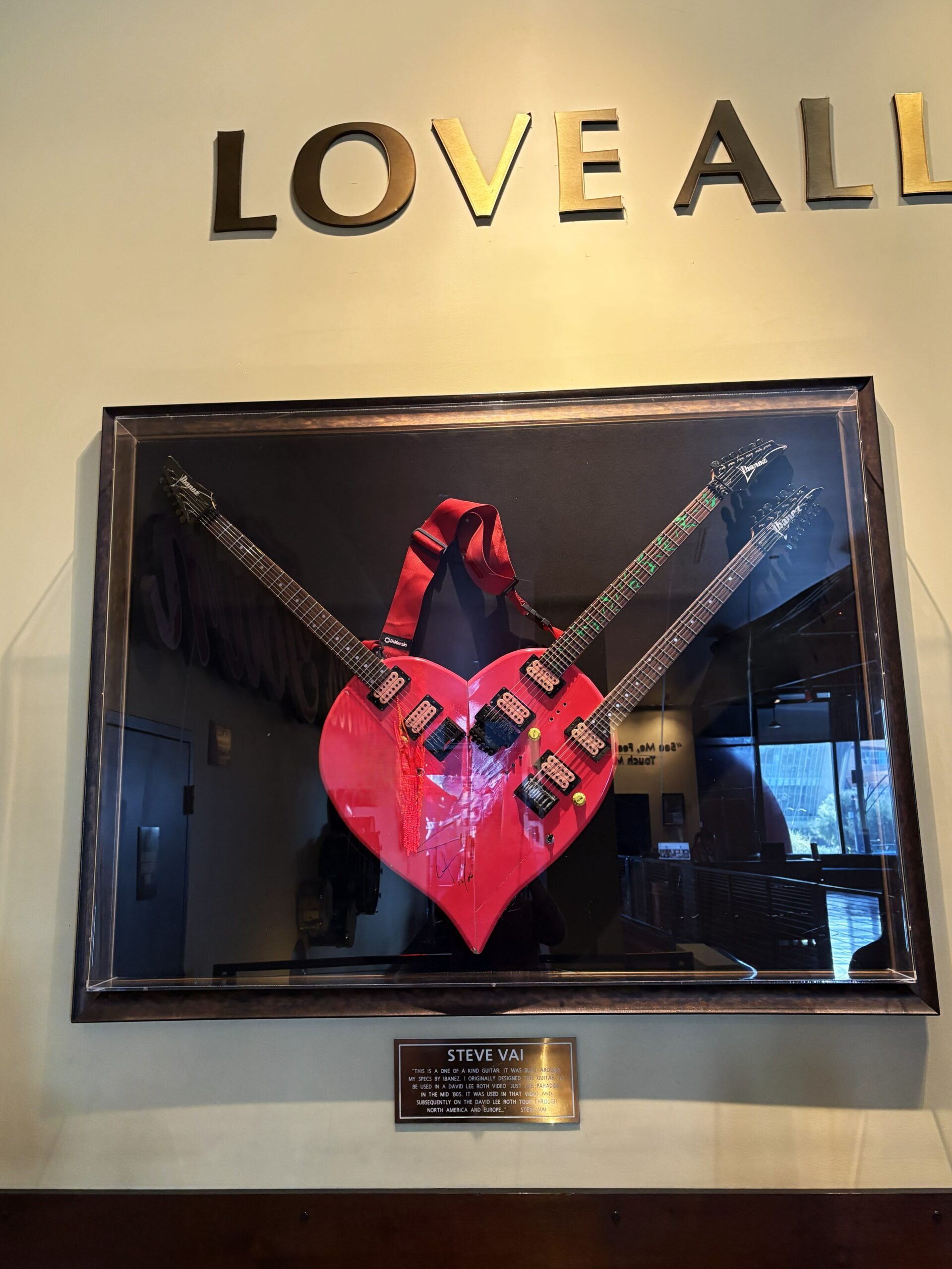 途中、ハードロックカフェでビールを飲んでいたら、エディー・ヴァンヘイレン(Edward Van Halen)のギターとデイヴィッド・リー・ロス(David Lee Roth)バンド期のスティーヴ・ヴァイ(Steve Vai)のハート形の特徴のあるギターが同じ壁に飾られているのを見た。