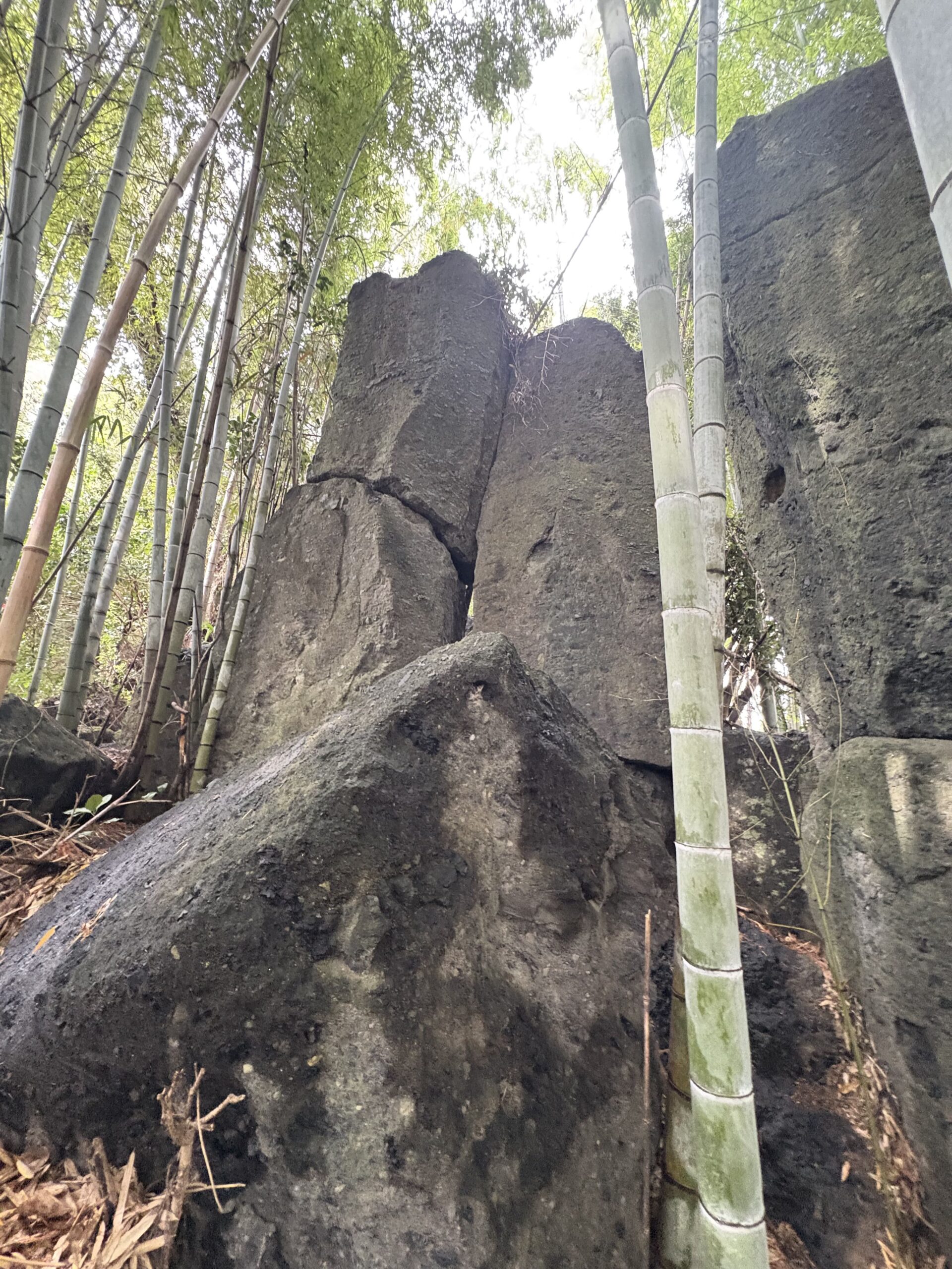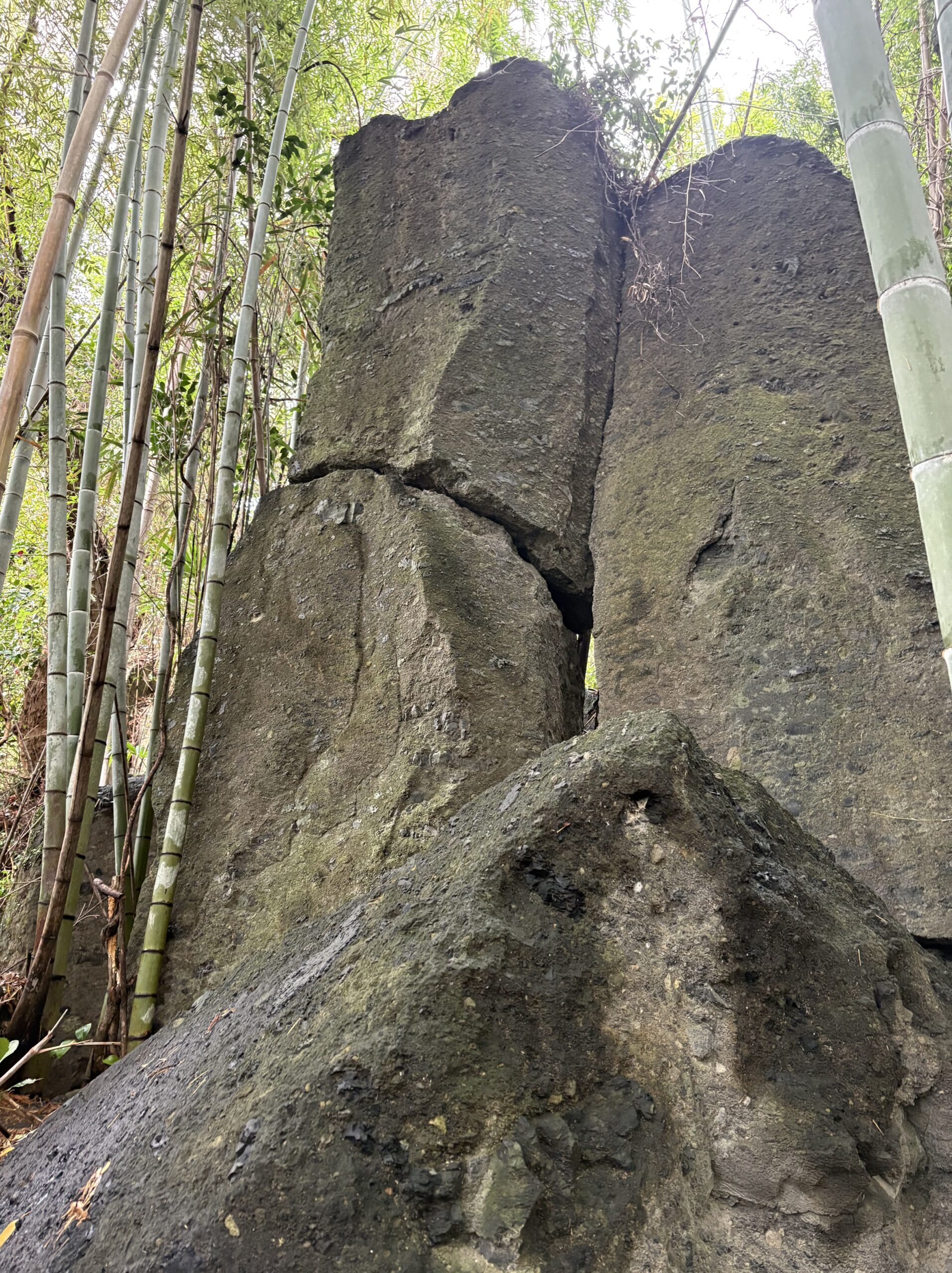 人工ではないとの話もあるが、社殿横の2本は同じ石の上(台座)に並んで立っているようにも見えるし、、あるいは一部人の手が入っているのかもしれない、、