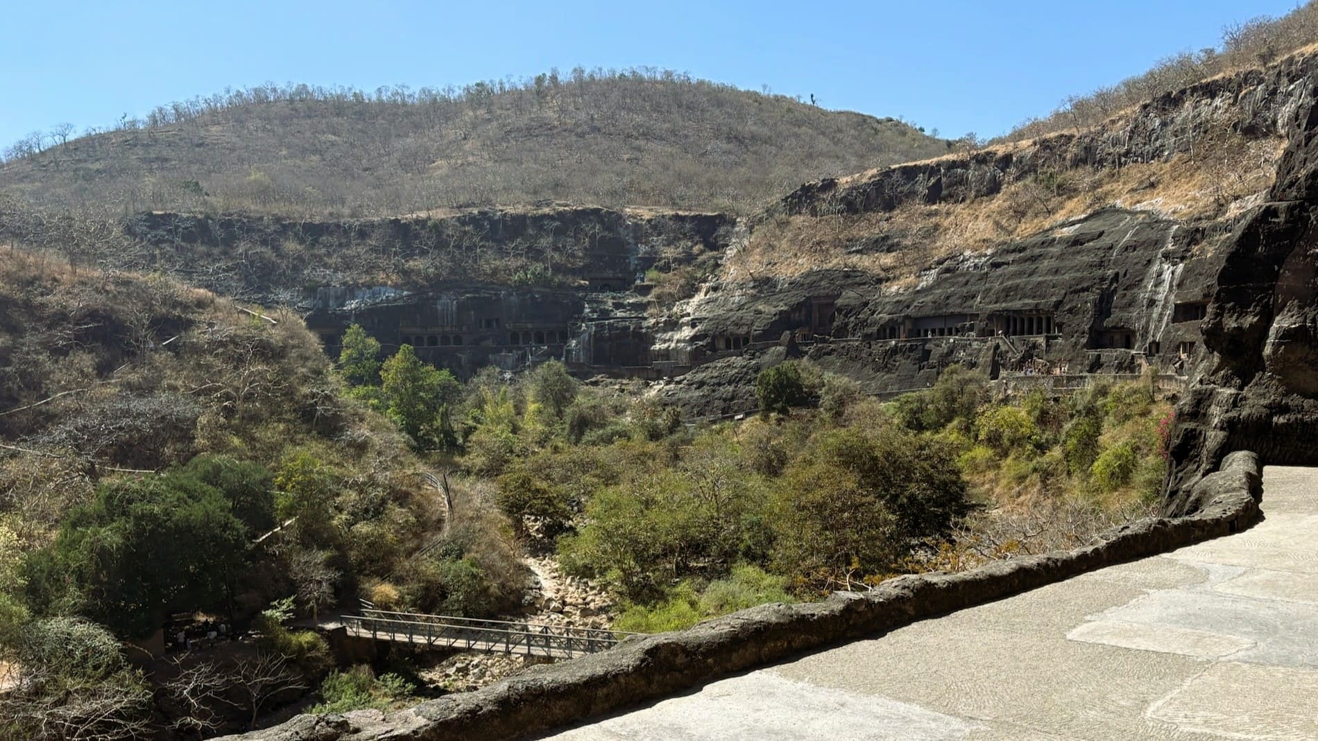 - 川に沿った断崖に作られたアジャンタ石窟群