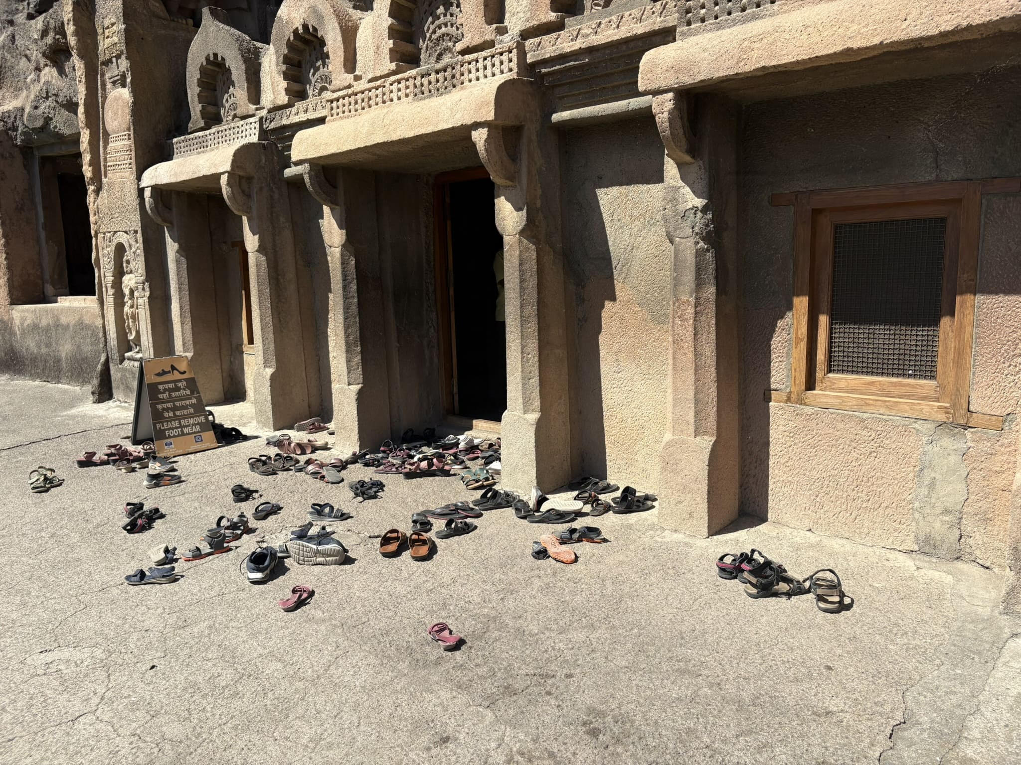 - 石窟の入り口の脱ぎ散らかした子供の靴
