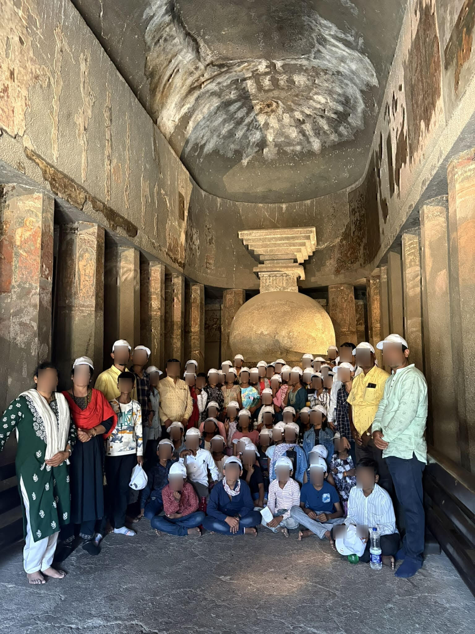 ある石窟の前に子供たち、おそらく学校の授業の一環で見学に来ている集団の靴が脱いであった。中をのぞくと、、