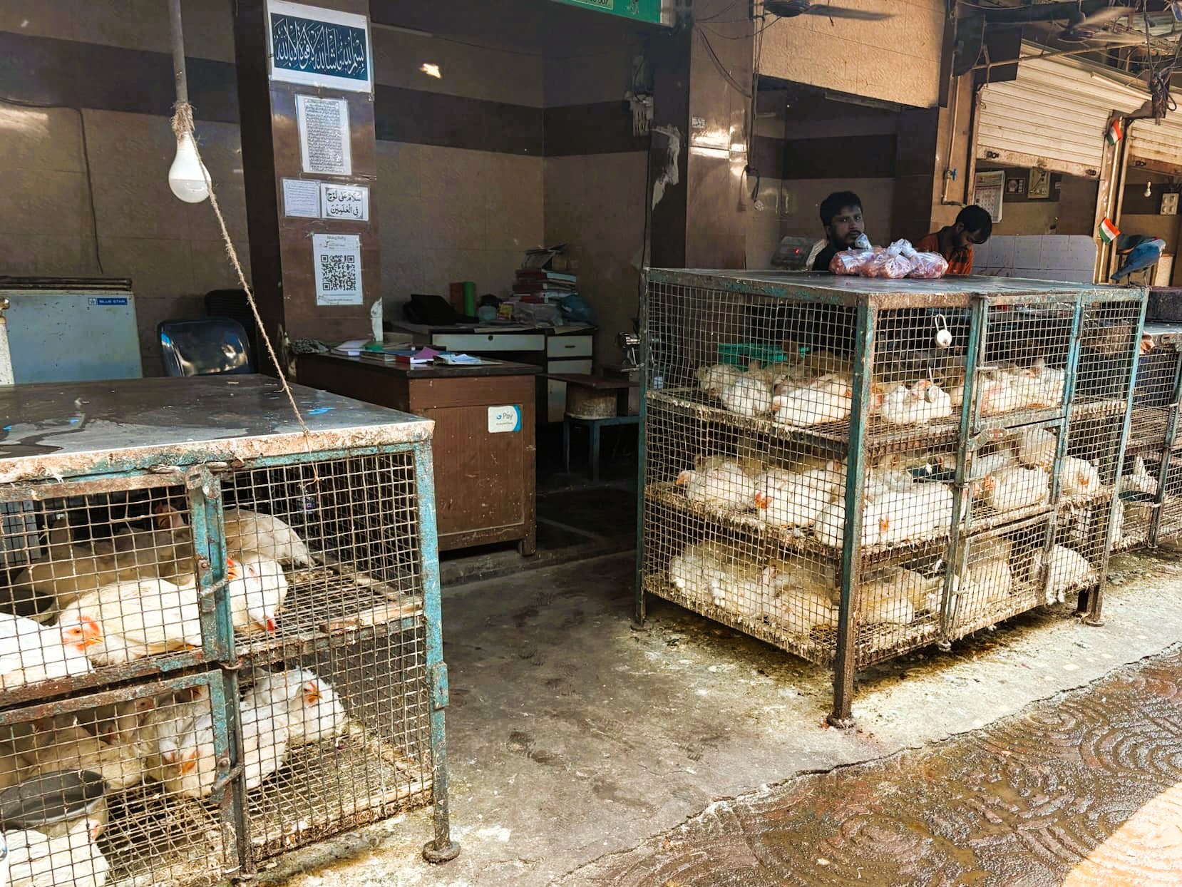 鉄の格子のかごに入れられた、ニワトリたちが通りの両側にたくさん並べられている。