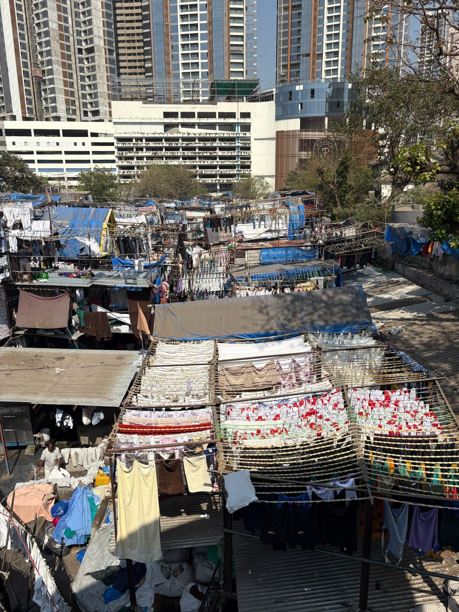 大量の洗濯物の並ぶ一帯と背後の高層ビルの対比。