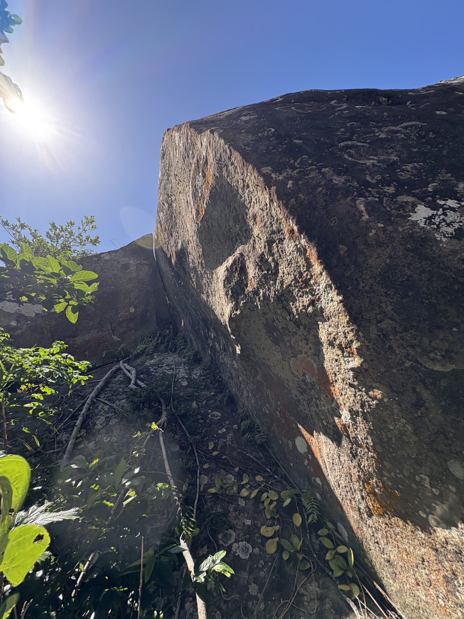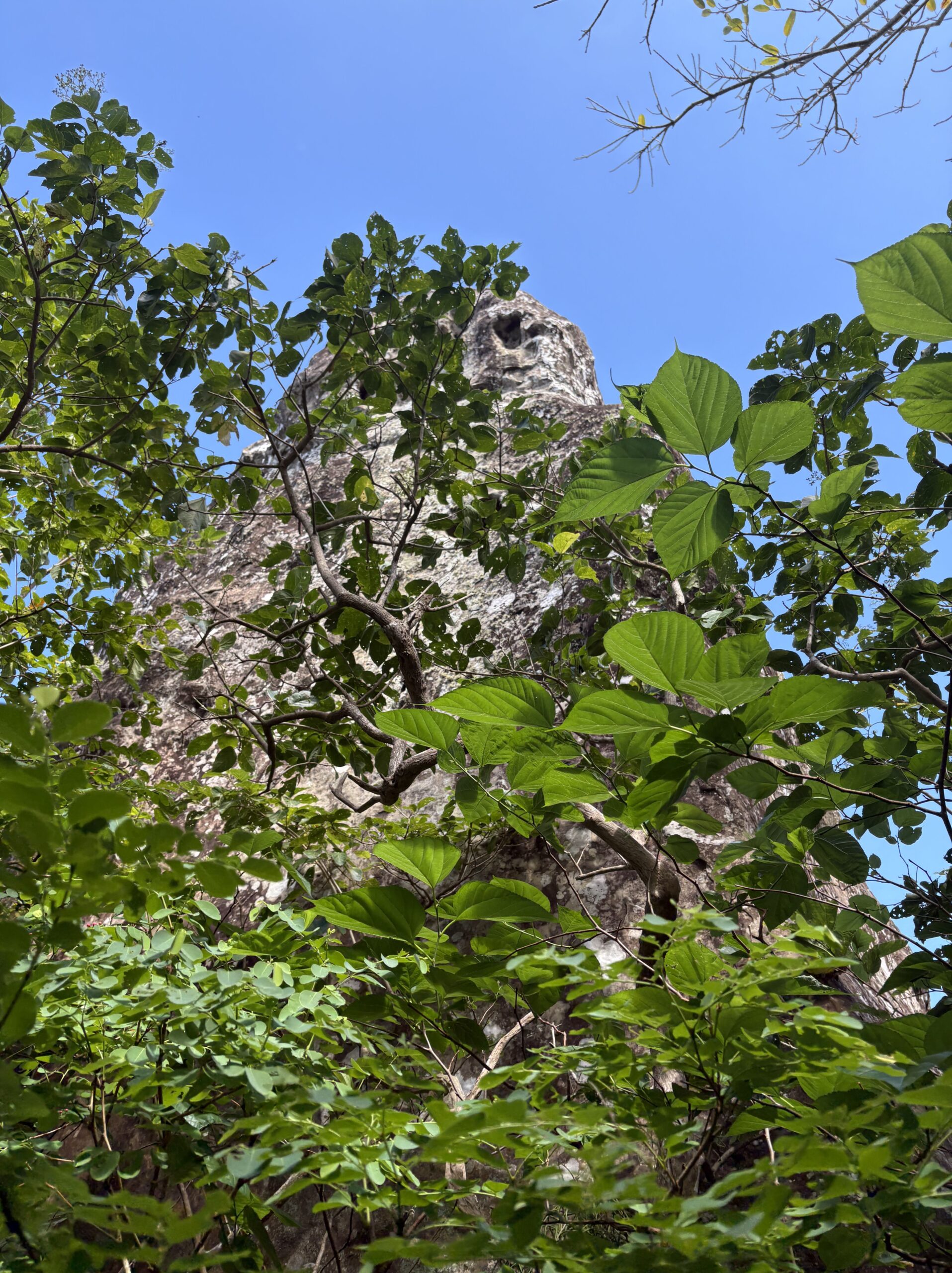 傾斜がきつい、木の枝につかまりながら上を目指す。しばらくすると岩の根元が見えてきた。3つの石のどこにいるのかは岩が大きすぎてよくわからない。