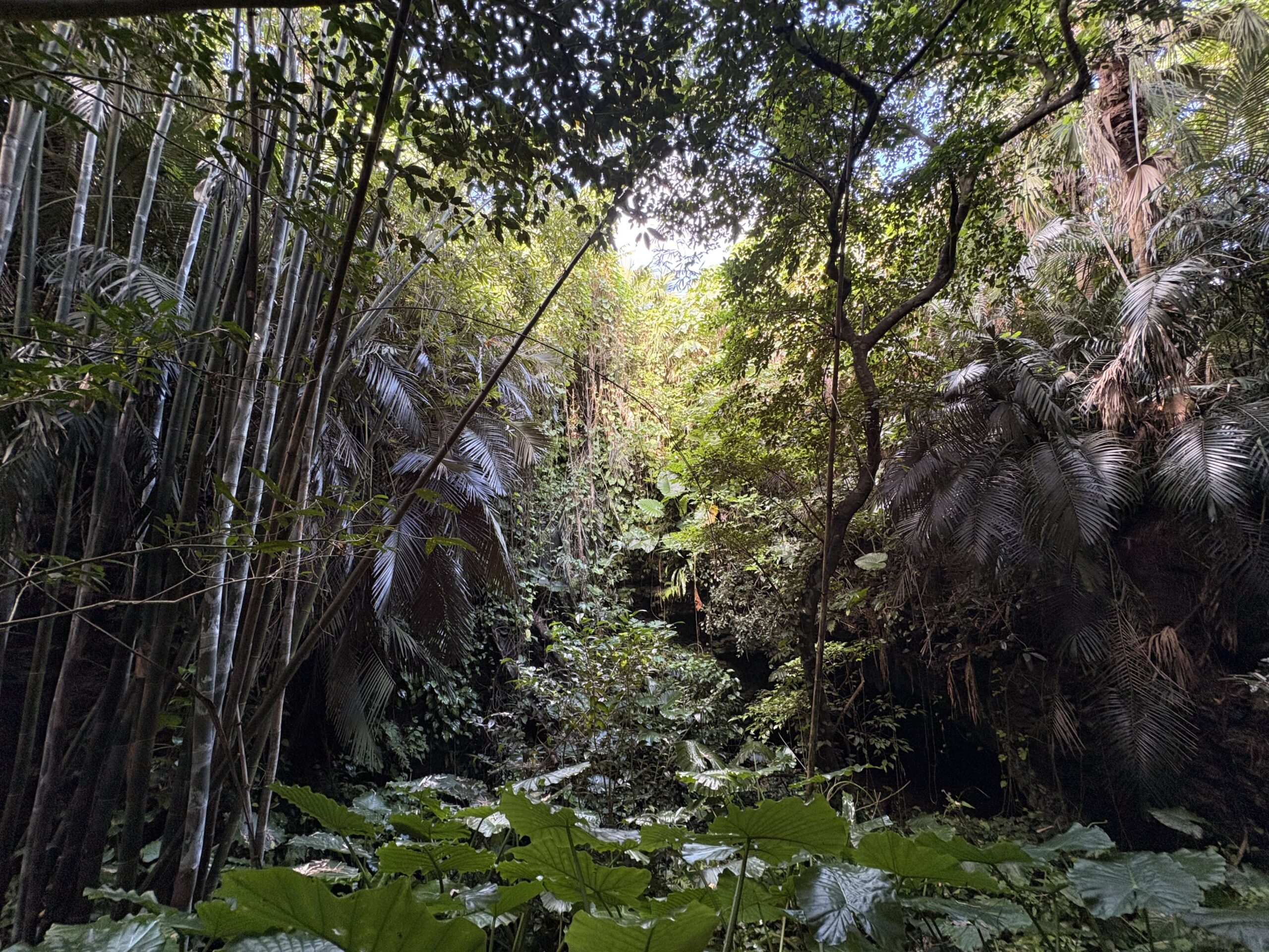 鬱蒼と植物の茂る薄暗い窪地を降りていく、奥の方に水場が見える、、