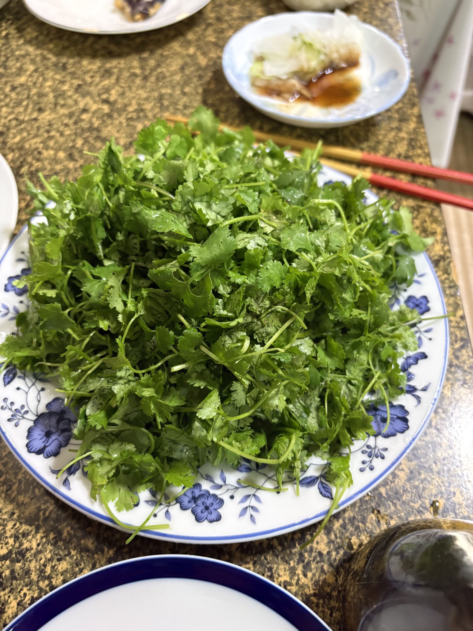 手作りの餅を食べ、新鮮なパクチーをあてに泡盛どなんを飲む、、